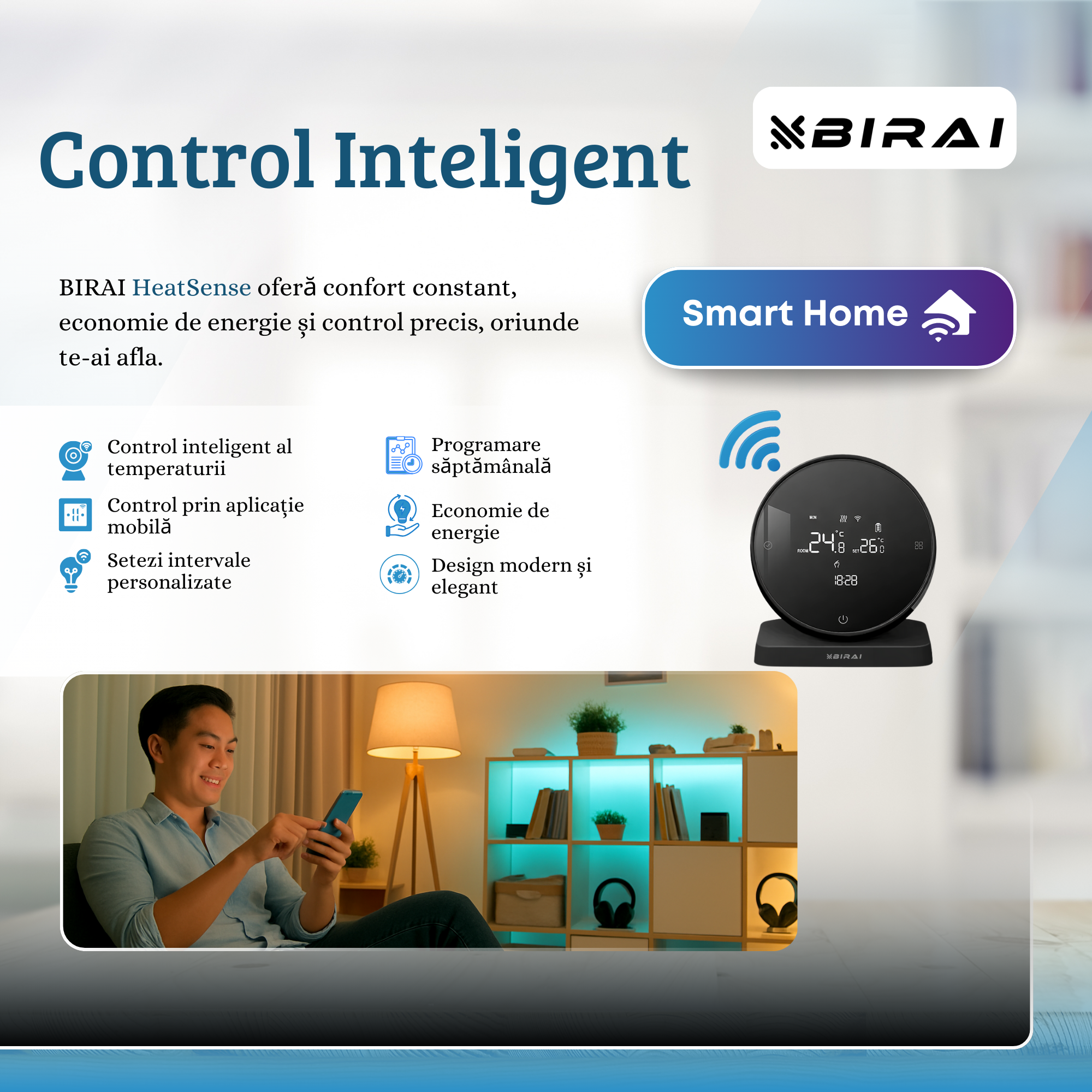 HeatSense by BIRAI® iti ofera libertatea de a regla temperatura de la distanta, din aplicatia mobila. Casa ta te intampina mereu cu temperatura potrivita, fara efort si fara compromisuri.