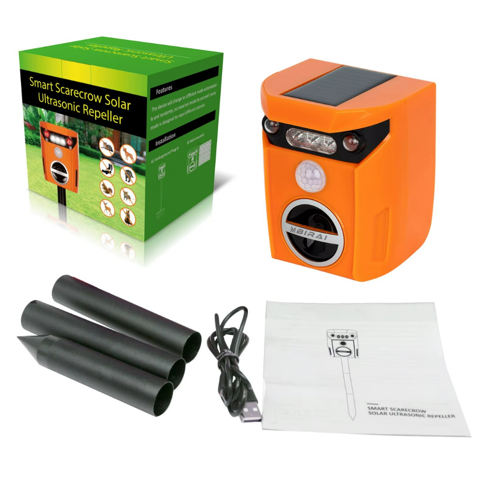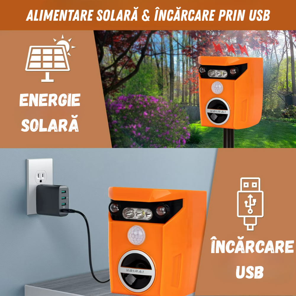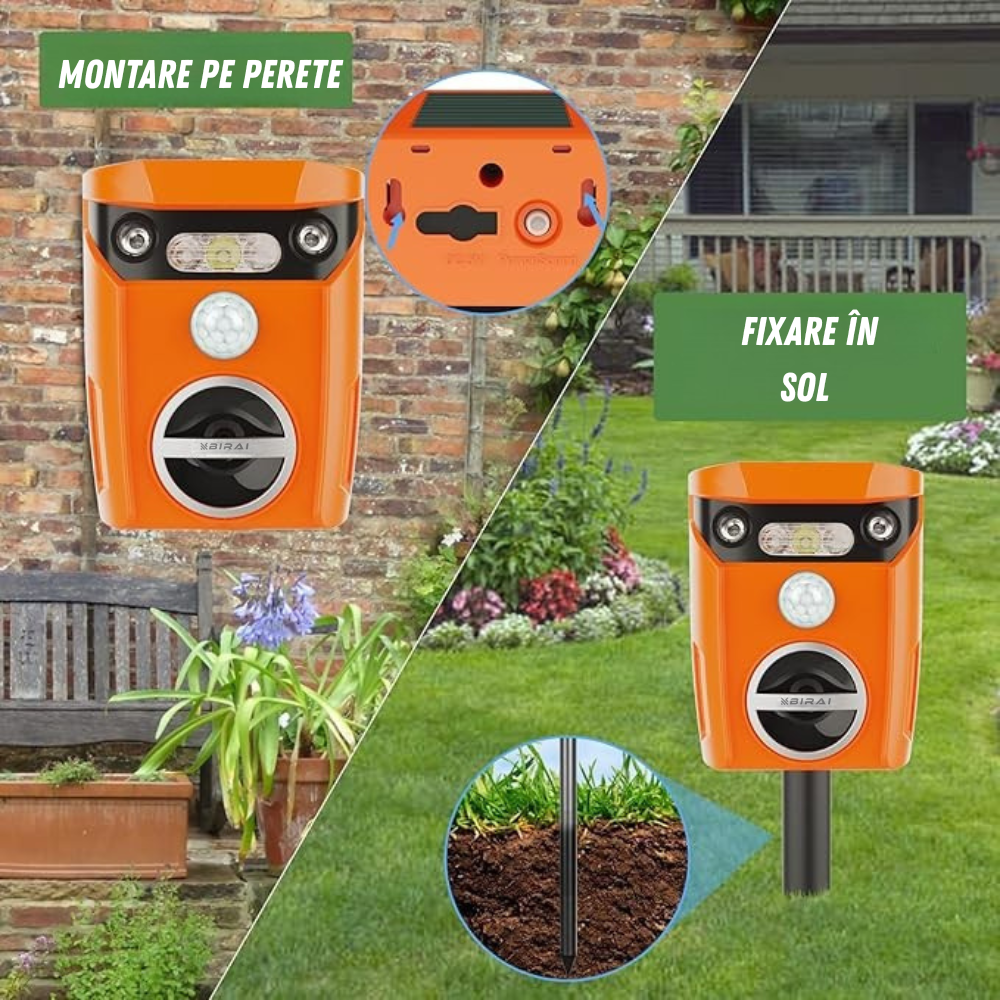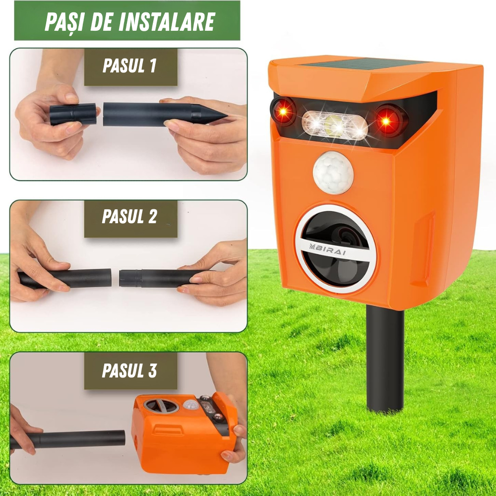 Birai AR01 este un dispozitiv ecologic, cu alimentare solară, ideal pentru alungarea pisicilor, câinilor, vulpilor și urșilor. Dispune de senzor de mișcare cu rază de 12m, acoperire largă de 150m² și protecție IPX65 împotriva ploii.