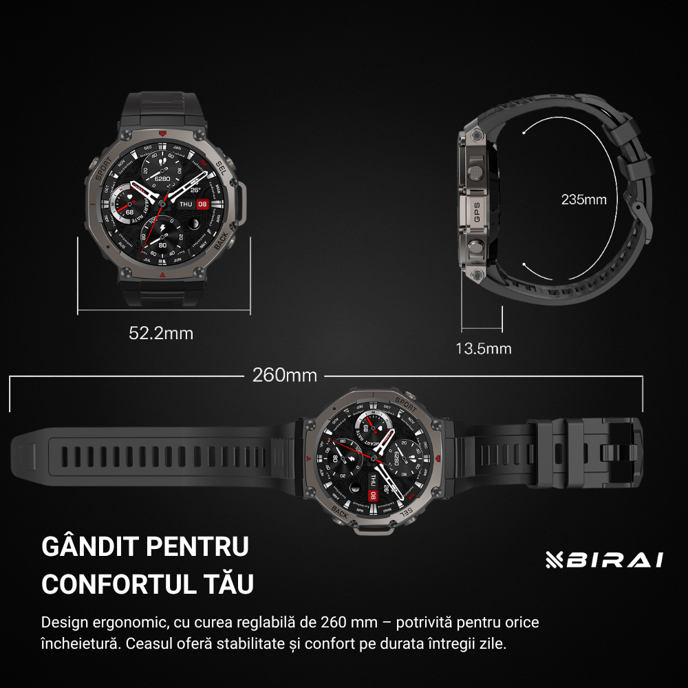 Smartwatch bărbați GloryFitPro BIRAI®, cu ecran AMOLED 1.43″, GPS ultra precis, rezistență la apă 5ATM și autonomie extinsă. Suportă apeluri Bluetooth, notificări în limba română și peste 170 moduri sport. Compatibil Android și iOS.