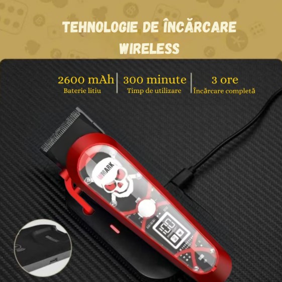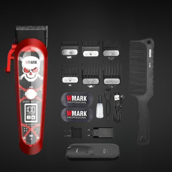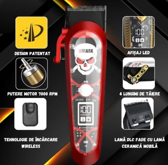 WMARK Elite By BIRAI® este o masina de tuns profesionala, echipata cu motor puternic de 7000 RPM, incarcare wireless si USB Type-C si afisaj LED modern, oferind precizie, performanta si confort pentru uz profesional sau personal.